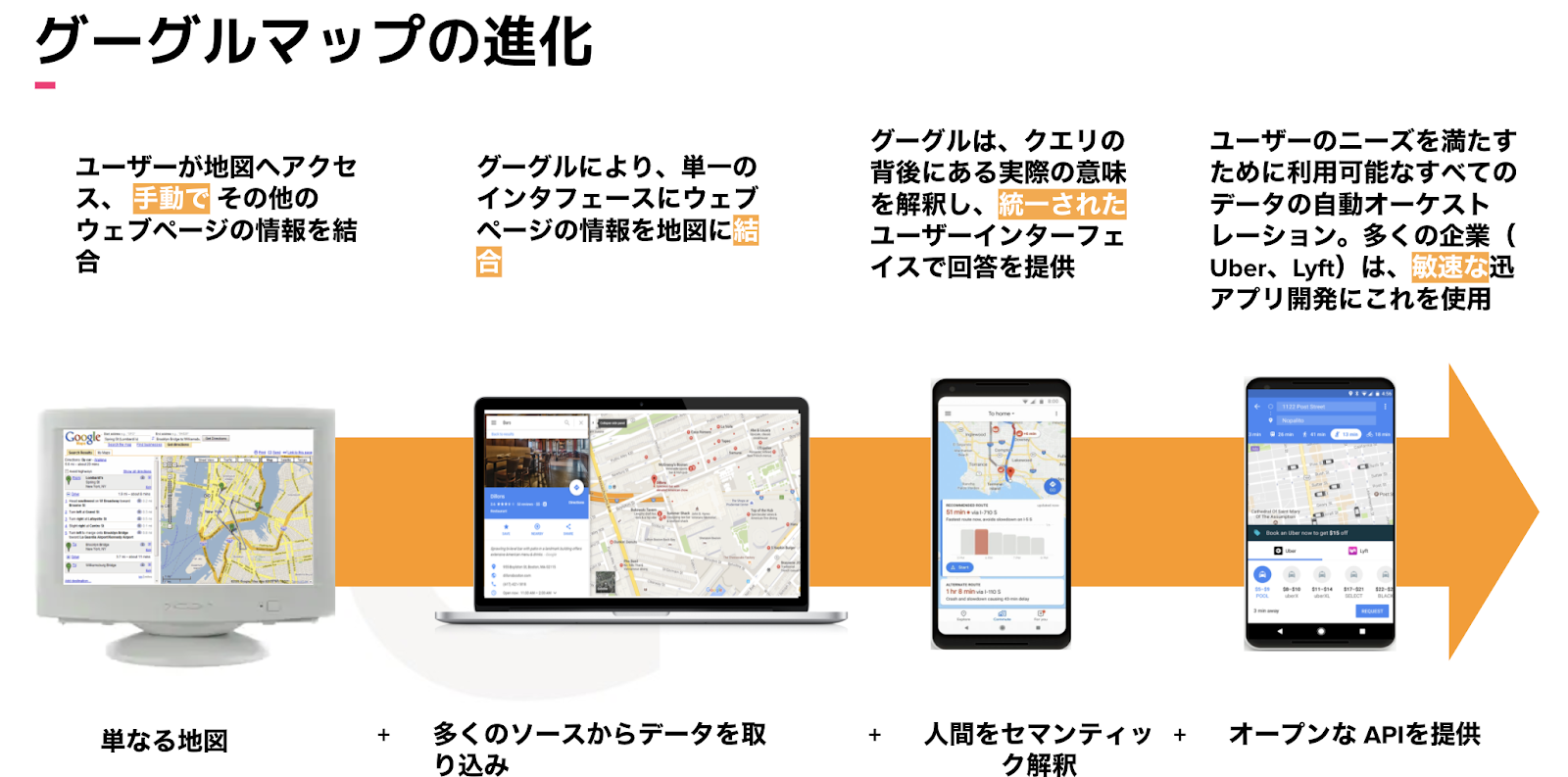 コンテキスト化によって恩恵を受けている身近な例は、グーグルマップです。初期のグーグルマップは単なる地図でしたが、そこに店舗情報、ルート情報、経過時間など多くの異なるシステムからデータを取り込み、それらのデータと地図の関連づけを行いました。これにより、優れたユーザーエクスペリエンスという利用者にとっての大きな価値創出がなされました。さらに、Uberなどグーグル社のパートナー企業向けにオープンなAPIを提供し、パートナー企業は、より便利なツールを迅速に開発することが可能になりました。皆様も、お店への経路や混雑状況などがひと目で分かる便利さを体感したことはあるのではないでしょうか。
